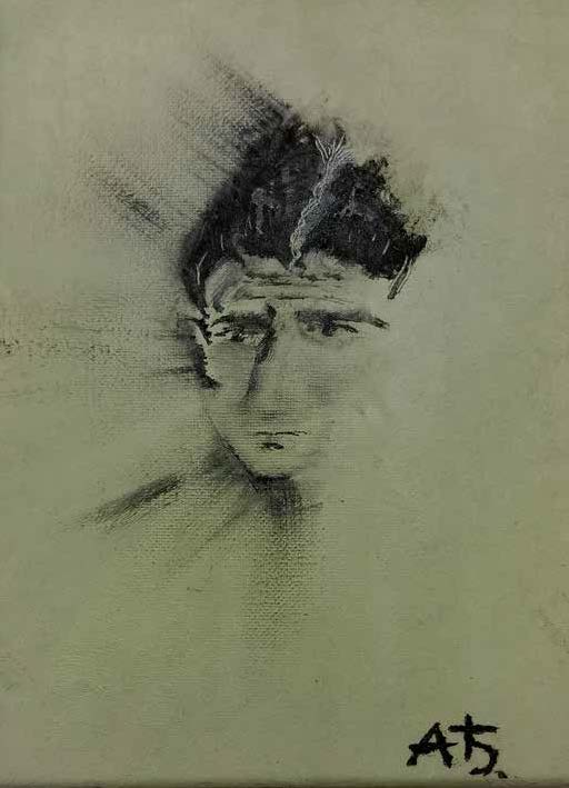 In tale Ritratto imperniato su un’attività che può essere anche molto dinamica per quanto astratta, quella del pensare, si notano molto evidenti le numerose rughe orizzontali sulla fronte riconducenti alla presenza di un’abitudine costante a una riflessione concettuale finalizzata a risolvere temi ardui alla comprensione, alla soluzione – le rughe sono numerose, coinvolgono tutta la fronte e appaiono profondamente incise. Il tipo di riflessione così enfatizzata nell’immagine, non evidenzia la presenza di soluzione ai problemi – le rughe sono una costante di tale pensiero altrimenti non potrebbero avere quella spazialità. È anche autoevidente come non sia una riflessione di ambito lieto, ma solo abbia il contrassegno della perplessità e del negativo, come emerge anche dall’atteggiamento della bocca, di rifiuto appena accennato secondo gli angoli impercettibilmente rivolti verso il basso: un giudizio a livello definitivo, globale, universale, coinvolgente l’esistere, ossia sulle cose dell’umano e dell’oltreumano, il tema bifronte su cui si concentra il pensiero di Kafka e come nella sua forma nel contesto dell’immagine. Per chiarire da che cosa si evinca nel dipinto la natura di tale pensiero, segue qualche giustificazione di quanto asserito. Al proposito risultano decisivi i colpi di spatola a sinistra guardando il dipinto e indirizzati da destra verso sinistra relativamente alla testa e al volto da cui prendono l’avvio, energici, sempre più sottili, non confusi, manifestano come questo arduo pensiero razionale, logico, sorga dall’introspezione più profonda relativa al passato ontologico del pensante: i segni che partono dalla testa sono espressi in un nero intenso, mentre nel loro percorso all’indietro, in maggiore distanza dalla testa, si sfumano e si fanno molto più sottili, quasi invisibili. Ciò, ribadendo, denota un’introspezione profonda che dall’ambito del passato esistenziale strettamente personale sfocia in un passato molto più remoto, nel passato del senso originario della vita in generale, comprensivo delle proprie radici più lontane, un passato che finisce nel nulla, come i segni che cessano nell’impossibilità di comprendere il senso di tali radici della vita. In un percorso che dal passato ontologico prosegue verso il passato più lontano fino a penetrare nelle questioni metafisiche che si rivelano inaccessibili. Per un ulteriore chiarimento: i colpi di spatola non stanno a destra dell’immagine in un avanzamento verso l’ambiente esterno, verso la vita per così dire attiva, dove mancano completamente, bensì si rivolgono all’indietro, appunto introspettivamente al proprio passato esistenziale, divenendo sempre più sottili, perdendosi in un passato non più solo personale, ma anche più antico, quello che riguarda il passato della storia dei popoli, specificamente della propria cultura di appartenenza più antica, e ancora più antica: l’origine della vita. Per altro anche le cromie hanno sfumature per così dire anticate, evanescenti e un po’sbiadite, come si conviene ad antiche immagini, ad antiche vestigia di un antico passato.